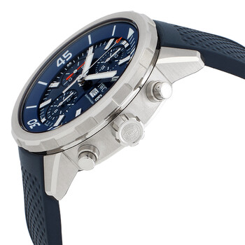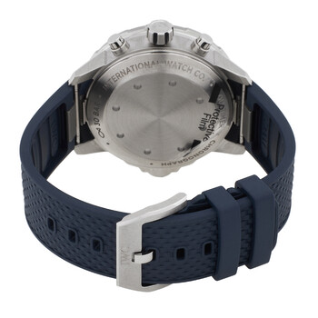 Silver-tone stainless steel case with a blue rubber strap. Fixed silver-tone stainless steel bezel. Blue dial with silver-tone hands and index hour markers. Minute markers around the outer rim. Dial Type: Analog. Luminescent hands and markers. Day of the week and date display at the 3 o'clock position. Chronograph - three sub-dials displaying: 60 second, 30 minute and 12 hour. IWC Calibre 79320 Automatic movement, based upon ETA 7750, containing 31 Jewels, bitting at 28800 vph, and has a power reserve of approximately 44 hours. Scratch resistant sapphire crystal. Screw down crown. Solid case back. Round case shape, case size: 44 mm. Buckle clasp. Water resistant at 300 meters / 1000 feet. Functions: chronograph, day, date, hour, minute, second. Additional Info: original box, manual (complete accessories). Aquatimer Deep Two Series. Dive watch style. Watch label: Swiss Made. IWC Aquatimer Deep Two Chronograph Automatic Blue Dial Men's Watch IW376806.