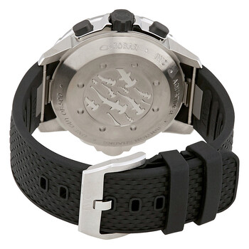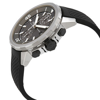 Silver-tone stainless steel case with a black rubber strap. Mechanical external/internal rotating silver-tone stainless steel bezel. Grey dial with gold-tone hands and index hour markers. Minute markers around the outer rim. Dial Type: Analog. Luminescent hands and markers. Date display at the 3 o'clock position. Chronograph - two sub-dials displaying: 60 second and 60 minutes. IWC Calibre 89365 Automatic movement, based upon IWC 89361, containing 38 Jewels, bitting at 28800 vph, and has a power reserve of approximately 68 hours. Scratch resistant sapphire crystal. Screw down crown. Solid case back. Round case shape, case size: 44 mm, case thickness: 16.9 mm. Pin buckle clasp. Water resistant at 300 meters / 1000 feet. Functions: chronograph, date, hour, minute, second. Aquatimer Series. Dive watch style. Watch label: Swiss Made. IWC Aquatimer Grey Dial Automatic Men's Chronograph Watch IW379506.