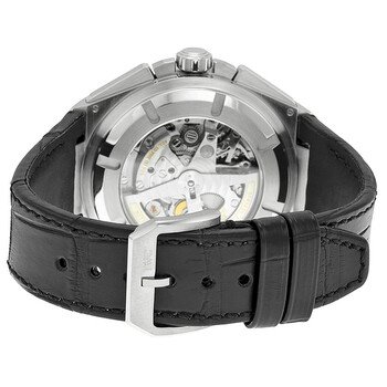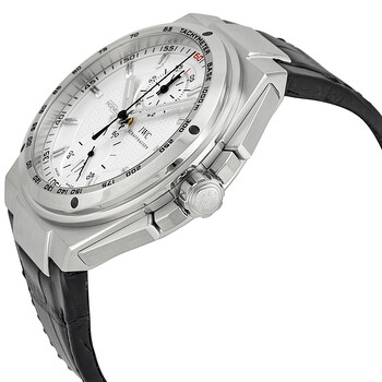 Stainless steel case with a black leather strap. Fixed stainless steel bezel. Silver dial with silver-tone hands and index hour markers. Minute markers around the outer rim. Dial Type: Analog. Luminescent hands and markers. Date display at the 6 o'clock position. Chronograph - two sub-dials displaying: 60 second and 60 minute. Automatic movement with a 68 hour power reserve. Scratch resistant sapphire crystal. Screw down crown. Skeleton case back. Case diameter: 45.5 mm. Round case shape. Tang clasp. Water resistant at 120 meters / 400 feet. Functions: chronograph, tachymeter date, hour, minute, second. Luxury watch style. IWC Big Ingenieur Chronograph Automatic Silver Dial Black Leather Men's Watch 378405.