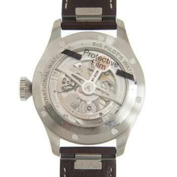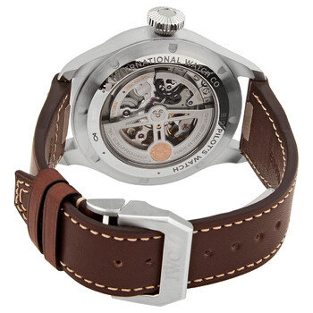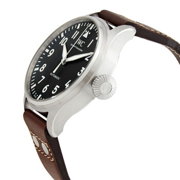 Stainless steel case with a brown leather strap. Fixed stainless steel bezel. Black dial with lumiunous silver-tone hands and Arabic numeral hour markers. Minute markers around the outer rim. Luminescent hands and markers. IWC Calibre 82100 automatic movement with a 60-hour power reserve. Scratch resistant sapphire crystal. Screw down crown. Transparent case back. Round case shape. Case size: 43 mm. Case thickness: 13 mm. Deployment clasp. Water resistant at 100 meters / 330 feet. Functions: hour, minute, second. Big Pilot Series. Sport watch style. Watch label: Swiss Made. IWC Big Pilot 43 Automatic Black Dial Men's Watch IW329301.