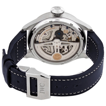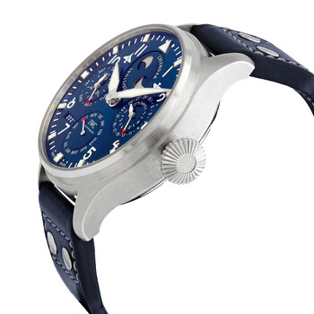 Stainless steel case with a blue (calfskin) leather strap. Fixed stainless steel bezel. Blue dial with luminous silver-tone hands and Arabic numeral hour markers. Minute markers around the outer rim. Dial Type: Analog. Luminescent hands and markers. Perpetual calendar. Four sub-dials displaying: moonphase, month, combined day and 60 second, combined date and power reserve. IWC calibre 52615 automatic movement, based upon IWC 52010, containing 54 Jewels, bitting at 28800 vph, and has a power reserve of approximately 168 hours. Scratch resistant sapphire crystal. Screw down crown. Transparent case back. Round case shape. Case size: 46.2 mm. Case thickness: 15.4 mm. Band width: 22 mm. Fold over clasp. Water resistant at 60 meters / 200 feet. Functions: perpetual calendar, moon phase, year, month, date, day, hour, minute, small second, power reserve indicator. Big Pilot Series. Luxury watch style. Watch label: Swiss Made. IWC Big Pilot Perpetual Automatic Blue Dial Men's Watch IW503605.