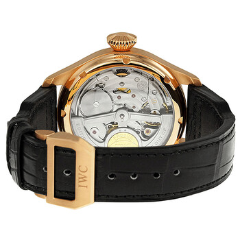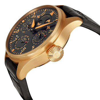 18kt rose gold case with a brown alligator leather strap. Fixed 18kt rose gold bezel. Black dial with gold-toned hands and Arabic numeral hour markers. Minute markers around the outer rim. Dial Type: Analog. Luminescent hands and markers. Four sub-dials displaying: perpetual calendar, combined day of the week and 60 second, month and date. Automatic movement. Scratch resistant sapphire crystal. Pull / push crown. Transparent case back. Case diameter: 46 mm. Case thickness: 16 mm. Round case shape. Band length: 8.5 inches. 18kt rose gold tang clasp. Water resistant at 30 meters / 100 feet. Functions: hour, minute, second, calendar, moonphase. Additional Info: Perpetual calendar with displays for the date, day, month, year in four digits and perpetual moon phase. Luxury watch style. Watch label: Swiss Made. IWC Big Pilot Perpetual Bucherer Black Dial 18kt Rose Gold Black Leather Men's Watch IW502635.
