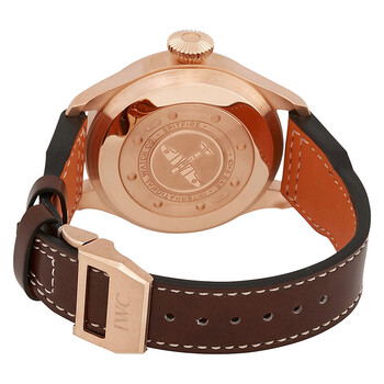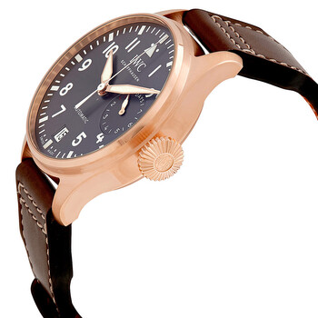 18 carat rose gold case with a brown santoni calfskin leather strap. Fixed bezel. Slate grey dial with gold-tone hands and Arabic numeral hour markers. Dial Type: Analog. Date display at the 6 o'clock position. One- power reserve. 51111 automatic movement with about 7 days (168 hours) of power reserve. Scratch resistant sapphire crystal. Screw down crown. Solid case back. Case size: 46 mm. Case thickness: 16 mm. Round case shape. Water resistant at 60 meters / 200 feet. Functions: date, hour, minute, second, power reserve. Luxury watch style. Watch label: Swiss Made. IWC Big Pilot Spitfire Slate Grey Dial Automatic Men's Watch IW500917.