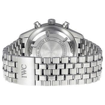 Stainless steel case with a stainless steel bracelet. Fixed stainless steel bezel. Black dial with luminous hands and Arabic numeral hour markers. Minute markers around the outer rim. Day and date display the at 3 o'clock position. Chronograph - three sub-dials displaying: 60 seconds (with stop function), 30 minutes and 12 hours. Automatic movement. Scratch resistant convex sapphire crystal. Screw down crown. Solid case back. 44-hour power reserve. Case diameter: 42 mm. Case thickness: 14.7 mm. Push button deployment clasp. Water resistant at 60 meters / 200 feet. Functions: hours, minutes, seconds. IWC Classic Pilot Chrono Automatic Steel Men's Watch 3717-04.