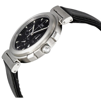Stainless steel case with a black leather strap. Fixed stainless steel bezel. Black dial with luminous silver-tone hands and luminous index hour markers. Minute markers around the outer rim. Dial Type: analog. Date display appears between the 4 and 5 o'clock position. Chronograph - three sub-dials displaying: 12- hours, 30- minutes and 60- seconds.Mechanical quartz movement. Scratch resistant sapphire crystal. Case diameter: 36 mm. Deployment clasp. Functions: hours, minutes, seconds, calendar, chronograph. Luxury Sport watch style. IWC Da Vinci SL Black Dial Chronograph Men's Watch IW372806.