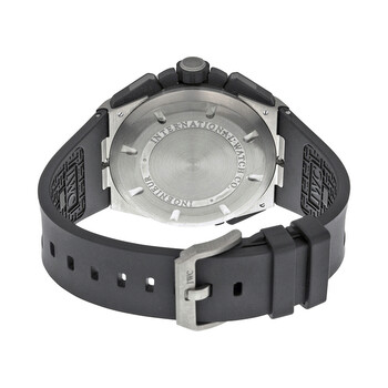 Titanium case with a black rubber strap. Fixed titanium bezel. Black dial with luminous silver-tone hands and index hour markers. Minute markers around the outer rim. Dial Type: Analog. Luminescent hands and markers. Day of the week and date display at the 3 o'clock position. Chronograph - three sub-dials displaying: 60 second, 30 minute and 12 hour. Automatic movement with a 44-hour power reserve. Scratch resistant sapphire crystal. Screw down crown. Solid case back. Case diameter: 45.5 mm. Case thickness: 16 mm. Round case shape. Band width: 20 mm. Band length: 9 inches. Tang clasp. Water resistant at 120 meters / 400 feet. Functions: date, day, hour, minute, second. Casual watch style. Watch label: Swiss Made. IWC Ingenieur Chronograph Black Dial Black Rubber Men's Watch IW376501.