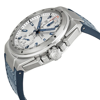 Stainless steel case with a blue leather strap. Fixed stainless steel bezel showing tachymeter markings. Silver dial with luminous blue hands and index hour markers. Minute markers around the outer rim. Dial Type: Analog. Luminescent hands and markers. Date display at the 6 o'clock position. Chronograph - two sub-dials displaying: 60 second and 60 minute. Automatic movement with 68 hour power reserve. Scratch resistant sapphire crystal. Screw down crown. Solid case back. Case diameter: 46 mm. Case thickness: 15 mm. Round case shape. Tang clasp. Water resistant at 120 meters / 400 feet. Functions: hours, minutes, seconds, date, flyback chronograph, stopwatch, hour and minute counters. Luxury watch style. Watch label: Swiss Made. IWC Ingenieur Chronograph Racer Silver Dial Rubber Strap Men's Watch IW378509.