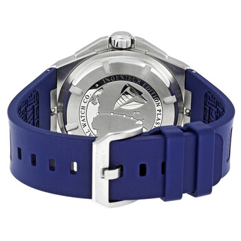 Stainless steel case with a blue rubber strap. Fixed stainless steel bezel. White dial with luminous blue-tipped hands and index hour markers. Arabic numerals mark the 6 and 12 o'clock positions. Minute markers around the outer rim. Dial Type: Analog. Date display appears at the 3 o'clock position. Mechanical movement. Scratch resistant sapphire crystal. Solid case back. Case diameter: 46 mm. Case thickness: 15 mm. Tang clasp. Water resistant at 120 meters. Functions: hours, minutes, seconds, date. Dress watch style. IWC Ingenieur Mission Earth White Dial Blue Rubber Strap Automatic Men's Watch IW323608.