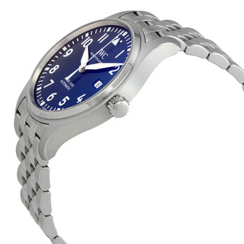 Silver-tone stainless steel case and bracelet. Fixed silver-tone bezel. Blue dial with silver-tone hands and Arabic numeral hour markers. Dial Type: Analog. Luminescent hands and markers. Date display at the 3 o'clock position. IWC calibre 30110 automatic movement with a 42-hour power reserve. Scratch resistant sapphire crystal. Screw down crown. Case size: 40 mm. Case thickness: 11 mm. Round case shape. Deployment clasp. Water resistant at 60 meters / 200 feet. Functions: date, hour, minute, second. Luxury watch style. Watch label: Swiss Made. IWC Le Petit Prince XVIII Automatic Blue Dial Men's Watch IW327014.