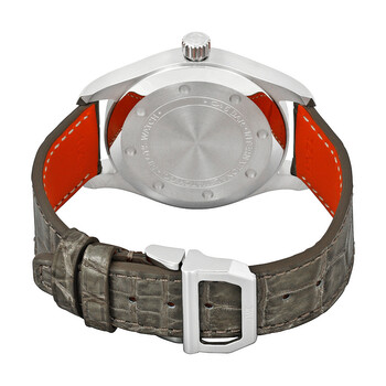 Silver-tone stainless steel case with a grey alligator leather strap. Fixed silver-tone stainless steel bezel. Silver dial with luminous black hands and Arabic numeral hour markers. Minute markers around the outer rim. Dial Type: Analog. Luminescent hands and markers. Date display at the 3 o'clock position. IWC Calibre 35111 Automatic movement, based upon Sellita SW300-1, containing 25 Jewels, composed of 163 parts, bitting at 28800 vph, and has a power reserve of approximately 42 hours. Scratch resistant sapphire crystal. Screw down crown. Solid case back. Round case shape, case size: 36 mm, case thickness: 10.5 mm. Tang clasp. Water resistant at 60 meters / 200 feet. Functions: date, hour, minute, second. Pilot Series. Pilot watch style. Watch label: Swiss Made. IWC Pilot Automatic Silver Dial Men's Watch IW324007.