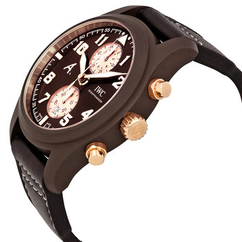 Brown ceramic case with a brown leather strap. Fixed brown ceramic bezel. Brown/rose gold dial with luminous rose gold hands and Arabic numeral hour markers. Minute markers around the outer rim. Dial Type: Analog. Luminescent hands and markers. Date display at the 6 o'clock position. Chronograph - two sub-dials displaying: combined hour and minute totalizer and small hacking seconds sub-dials. IWC calibre 89361 automatic movement, based upon IWC 89360, containing 38 Jewels, and has a power reserve of approximately 68 hours. Scratch resistant sapphire crystal. Rose gold crown. Solid rose gold case back. Round case shape. Case size: 46 mm. Case thickness: 16.5 mm. Water resistant at 60 meters / 200 feet. Functions: chronograph, flyback, date, hour, minute, small second. Pilot Series. Pilot watch style. Watch label: Swiss Made. IWC Pilot Brown Dial Chronograph Automatic Men's Watch IW388006.