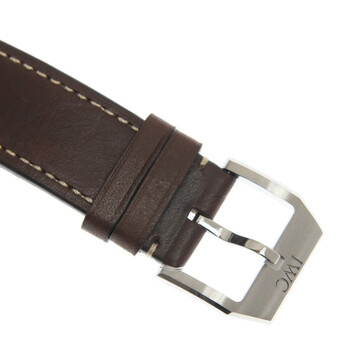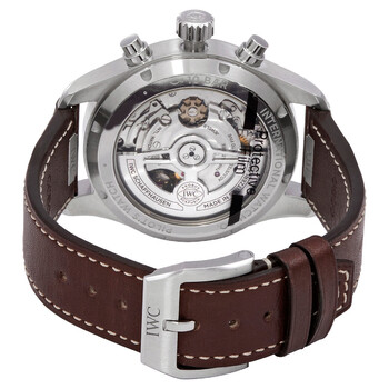 Stainless steel case with a brown (calfskin) leather strap. Fixed stainless steel bezel. Green dial with luminous silver-tone hands and Arabic numeral hour markers. Minute markers around the outer rim. Luminescent hands and markers. Day of the week and date display at the 3 o'clock position. Chronograph - three sub-dials displaying: 60 second, 30 minute and 1/10th of a second. IWC calibre 69385 automatic movement, containing 33 Jewels, composed of 231 parts, bitting at 28800 vph, and has a power reserve of approximately 46 hours. Scratch resistant sapphire crystal. Screw down crown. Transparent case back. Round case shape. Case size: 41 mm. Case thickness: 14.5 mm. Band width: 22 mm. Tang clasp. Water resistant at 100 meters / 330 feet. Functions: chronograph, hour, minute, second. Pilot Series. Sport watch style. Watch label: Swiss Made. IWC Pilot Chronograph 41 Automatic Green Dial Men's Watch IW388103.