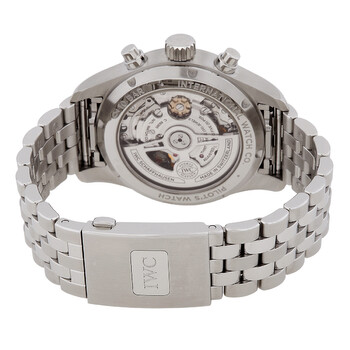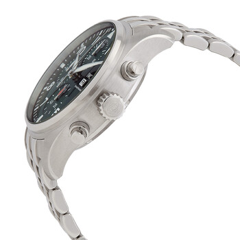 Stainless steel case with a silver-tone stainless steel bracelet. Fixed stainless steel bezel. Green dial with Arabic numeral hour markers. Day date display at the 3 o'clock position. Chronograph - three sub-dials displaying: 60 second, 30 minute and 1/10th of a second. IWC Calibre 69385 automatic movement with a 46-hour power reserve. Scratch resistant sapphire crystal. Screw down crown. Transparent see through case back. Round case shape, case size: 41 mm, case thickness: 14.5 mm. Tang clasp. Water resistant at 100 meters / 330 feet. Functions: chronograph, hour, minute, second. Pilot Series. Sport watch style. Watch label: Swiss Made. IWC Pilot Chronograph 41 Automatic Green Dial Men's Watch IW388104.