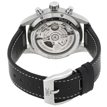 Silver-tone stainless steel case with a black leather strap. Fixed silver-tone stainless steel bezel. Blue dial with silver-tone hands and Arabic numeral hour markers. Minute markers around the outer rim. Luminescent hands and markers. Day of the week and date display at the 3 o'clock position. Chronograph - three sub-dials displaying: 60 second, 30 minute and 1/10th of a second. IWC Calibre 69385 Automatic movement, containing 33 Jewels, composed of 231 parts, bitting at 28800 vph, and has a power reserve of approximately 46 hours. Scratch resistant sapphire crystal. Screw down crown. Transparent case back. Round case shape, case size: 41 mm, case thickness: 14.5 mm. Tang clasp. Water resistant at 100 meters / 330 feet. Functions: chronograph, date, day, hour, minute, second. Pilot Series. Sport watch style. Watch label: Swiss Made. IWC Pilot Chronograph Automatic Blue Dial Men's Watch IW388101BK.