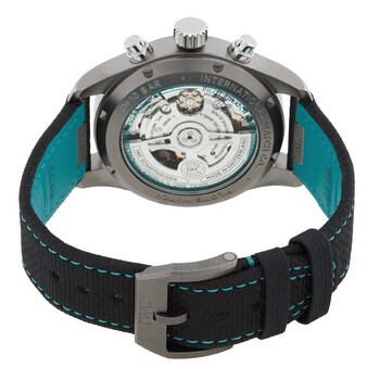 Titanium case with a green rubber strap. Fixed titanium bezel. Black and turquoise dial with turquoise hands and Arabic numeral hour markers. Dial Type: Analog. Day of the week and date display at the 3 o'clock position. Chronograph - three sub-dials displaying: 60 second, 30 minute and 12 hour. IWC Calibre 69385 Automatic movement, containing 33 Jewels, composed of 231 parts, bitting at 28800 vph, and has a power reserve of approximately 46 hours. Scratch resistant sapphire crystal. Screw down crown. Transparent see through case back. Round case shape, case size: 41 mm, case thickness: 14.5 mm. Buckle clasp. Water resistant at 100 meters / 330 feet. Functions: chronograph, column wheel, date, day, hour, minute, small second. Pilot Series. Luxury watch style. Watch label: Swiss Made. IWC Pilot Chronograph "Mercedes-AMG Petronas Formula One Team" Automatic Men's Watch IW388108.