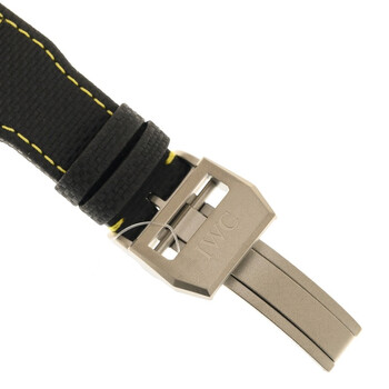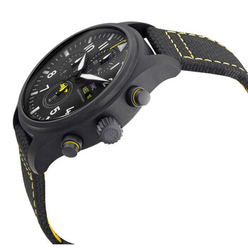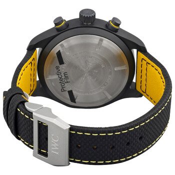 Black ceramic case with a black calfskin band. Fixed black ceramic bezel. Black dial with black hands and Arabic numeral hour markers. Minute markers around the outer rim. Dial Type: Analog. Luminescent hands and markers. Day of the week and date display at the 3 o'clock position. Chronograph - three sub-dials displaying: 60 second, 30 minute and 12 hour. IWC Calibre 69380 Automatic movement, based upon WC 69370, containing 33 Jewels, bitting at 28800 vph, and has a power reserve of approximately 48 hours. Scratch resistant sapphire crystal. Screw down crown. Solid case back. Round case shape, case size: 44.5 mm, case thickness: 15.7 mm. Band width: 21 mm. Water resistant at 60 meters / 200 feet. Functions: chronograph, column wheel, date, day, hour, minute, small second. Pilot Chronograph Royal Maces Series. Luxury watch style. Watch label: Swiss Made. IWC Pilot Chronograph Royal Maces Automatic Black Dial Men's Watch IW389107.