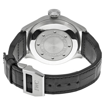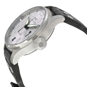 Silver-tone stainless steel case with a black leather strap. Fixed silver-tone stainless steel bezel. Silver dial with luminous hands and Arabic numeral hour markers. Minute markers around the outer rim. Dial Type: Analog. Date display at the 6 o'clock position. One subdial displaying: 7 day power reserve indicator. IWC Calibre 51111 Automatic movement, based upon IWC 5011, containing 42 Jewels, bitting at 21600 vph, and has a power reserve of approximately 168 hours. Scratch resistant sapphire crystal. Screw down crown. Solid case back. Round case shape, case size: 46.2 mm. Band width: 20.3 mm, band length: 8 inches. Deployment clasp. Water resistant at 60 meters / 200 feet. Functions: date, hour, minute, second, power reserve indicator. Pilot Series. Pilot watch style. Watch label: Swiss Made. IWC Pilot Father Automatic Silver Dial Black Leather Men's Watch 5009-06.