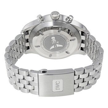 Stainless steel case with a stainless steel bracelet. Fixed stainless steel bezel. Blue dial with luminous silver-tone hands and Arabic numeral hour markers. Minute markers around the outer rim. Dial Type: Analog. Luminescent hands and markers. Day of the week and date display at the 3 o'clock position. Chronograph - three sub-dials displaying: 60 second, 30 minute and 12 hour. IWC calibre 79320 automatic movement, based upon ETA 7750, containing 31 Jewels, bitting at 28800 vph, and has a power reserve of approximately 44 hours. Scratch resistant sapphire crystal. Screw down crown. Solid case back. Round case shape. Case size: 43 mm. Case thickness: 15 mm. Band width: 20 mm. Fold over clasp with a push button release. Water resistant at 60 meters / 200 feet. Functions: chronograph, date, day of the week, hour, minute, second. Pilot Le Petit Prince Series. Pilot watch style. Watch label: Swiss Made. IWC Pilot Le Petit Prince Automatic Chronograph Men's Watch IW377717.
