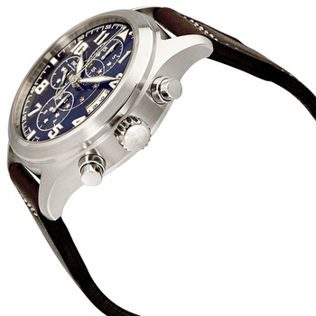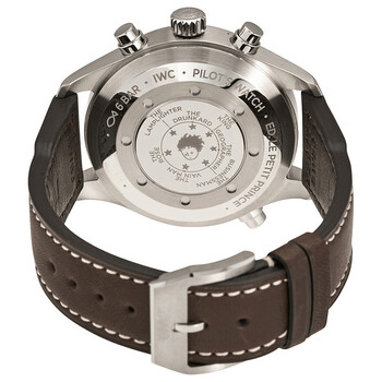 Silver-tone stainless steel case with a brown leather strap. Fixed silver-tone stainless steel bezel. Midnight blue dial with luminous silver-tone hands and Arabic numeral hour markers. Minute markers around the outer rim. Dial Type: Analog. Luminescent hands and markers. Date display at the 3 o'clock position. Chronograph - three sub-dials displaying: 60 second, 30 minute and 12 hour. IWC Calibre 79420 Automatic movement, based upon ETA 7750, containing 29 Jewels, bitting at 21600 vph, and has a power reserve of approximately 44 hours. Scratch resistant sapphire crystal. Screw down crown. Solid case back. Round case shape, case size: 44 mm, case thickness: 17 mm. Tang clasp. Water resistant at 60 meters / 200 feet. Functions: chronograph, rattrapante, date, day, hour, minute, small second. Additional Info: limited edition of 1000 pieces. Pilot Double Chronograph Series. Pilot watch style. Watch label: Swiss Made. IWC Pilot Midnight Double Chronograph Automatic Men's Watch IW371807.