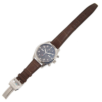 Silver-tone stainless steel case with a brown crocodile leather strap. Fixed silver-tone stainless steel bezel. Slate dial with silver-toned hands and Arabic numeral hour markers. Minute markers around the outer rim. Dial Type: Analog. Luminescent hands and markers. Perpetual calendar. Chronograph - two sub-dials displaying: combined hour and minute totalizer and small hacking seconds sub-dials. IWC Calibre 89801 Automatic movement, containing 51 Jewels, bitting at 28800 vph, and has a power reserve of approximately 68 hours. Scratch resistant sapphire crystal. Round case shape, case size: 46 mm. Water resistant at 60 meters / 200 feet. Functions: leap year, month, date, hour, minute, second, flyback chronograph, perpetual calendar. Pilot Spitfire Perpetual Calendar Series. Pilot watch style. Watch label: Swiss Made. IWC Pilot Spitfire Perpetual Calendar Automatic Men's Watch IW379107.