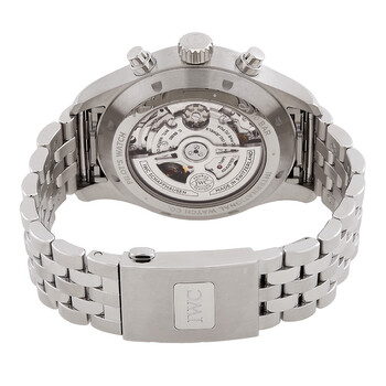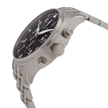 Silver-tone stainless steel case and bracelet. Fixed silver-tone stainless steel bezel. Black dial with silver-tone hands and Arabic numeral hour markers. Minute markers around the outer rim. Dial Type: Analog. Luminescent hands and markers. Day of the week and date display at the 3 o'clock position. Chronograph - three sub-dials displaying: 60 second, 30 minute and 12 hour. IWC Calibre 69385 Automatic movement, containing 33 Jewels, composed of 231 parts, bitting at 28800 vph, and has a power reserve of approximately 46 hours. Scratch resistant sapphire crystal. Screw down crown. Transparent see through case back. Round case shape, case size: 43 mm. Fold over clasp with a safety release. Water resistant at 100 meters / 330 feet. Functions: chronograph, column wheel, date, day, hour, minute, small second. Additional Info: original box, international warranty card, manual (complete accessories). Pilot's Series. Luxury watch style. Watch label: Swiss Made. IWC Pilots Chronograph Automatic Black Dial Men's Watch IW378002.