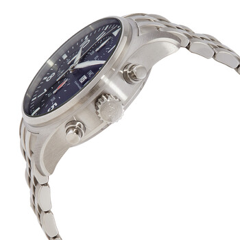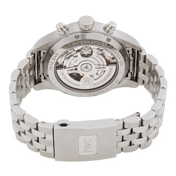 Silver-tone stainless steel case and bracelet. Fixed silver-tone stainless steel bezel. Black dial with silver-tone hands and Arabic numeral hour markers. Minute markers around the outer rim. Dial Type: Analog. Luminescent hands and markers. Day of the week and date display at the 3 o'clock position. Chronograph - three sub-dials displaying: 60 second, 30 minute and 12 hour. IWC Calibre 69385 Automatic movement, containing 33 Jewels, composed of 231 parts, bitting at 28800 vph, and has a power reserve of approximately 46 hours. Scratch resistant sapphire crystal. Screw down crown. Transparent see through case back. Round case shape, case size: 41 mm. Fold over clasp with a safety release. Water resistant at 100 meters / 330 feet. Functions: chronograph, column wheel, date, day, hour, minute, small second. Additional Info: original box, international warranty card, manual (complete accessories). Pilots Series. Luxury watch style. Watch label: Swiss Made. IWC Pilots Chronograph Automati