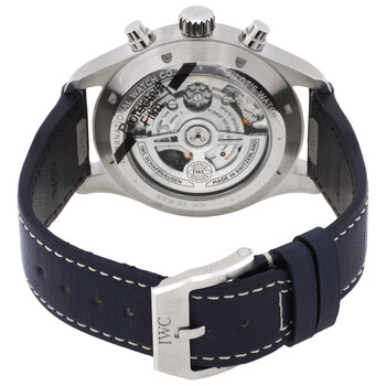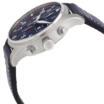 Silver-tone stainless steel case with a blue leather strap. Fixed silver-tone stainless steel bezel. Blue dial with silver-tone hands and Arabic numeral hour markers. Minute markers around the outer rim. Dial Type: Analog. Luminescent hands and markers. Day of the week and date display at the 3 o'clock position. Chronograph - three sub-dials displaying: 60 second, 30 minute and 12 hour. IWC Calibre 69385 Automatic movement, containing 33 Jewels, composed of 231 parts, bitting at 28800 vph, and has a power reserve of approximately 46 hours. Scratch resistant sapphire crystal. Screw down crown. Transparent see through case back. Round case shape, case size: 43 mm. Buckle clasp. Water resistant at 100 meters / 330 feet. Functions: chronograph, column wheel, date, day, hour, minute, small second. Additional Info: original box, manual (complete accessories). Pilots Series. Luxury watch style. Watch label: Swiss Made. IWC Pilots Chronograph Automatic Blue Dial Men's Watch IW378003.