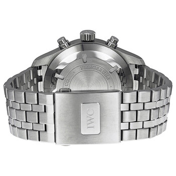 Stainless steel case with a stainless steel bracelet. Fixed stainless steel bezel. Black dial with silver-tone hands and Arabic numeral hour markers. Minute markers around the outer rim. Dial Type: Analog. Luminescent hands and markers. Day of the week and date display at the 3 position. Chronograph - three sub-dials displaying: 60 second, 30 minute and 12 hour. Automatic movement with a 44-hour power reserve. Scratch resistant sapphire crystal. Screw down crown. Solid case back. Case diameter: 43 mm. Round case shape. Band length: 7 inches. Deployment clasp with a push button release. Water resistant at 60 meters / 200 feet. Functions: chronograph, date, hour, minute, second. Luxury watch style. Watch label: Swiss Made. IWC Pilots Chronograph Automatic Stainless Steel Men's Watch IW377704.