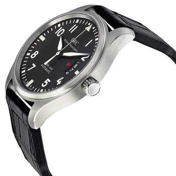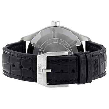 Stainless steel case with a black croco-embossed leather strap. Fixed stainless steel bezel. Black dial with silver-tone hands and Arabic numeral hour markers. Minute markers around the outer rim. Dial Type: Analog. Date display at the 3 o'clock position. Automatic movement with a 42-hour power reserve. Scratch resistant sapphire crystal. Screw down crown. Solid case back. Case diameter: 41 mm. Case thickness: 11 mm. Round case shape. Strap width: 17 mm. Strap length: 7 inches. Tang clasp. Water resistant at 60 meters / 200 feet. Functions: date, hour, minute, second. Luxury watch style. Watch label: Swiss Made. IWC Pilots Mark XVII Black Alligator Men's Watch IW326501.