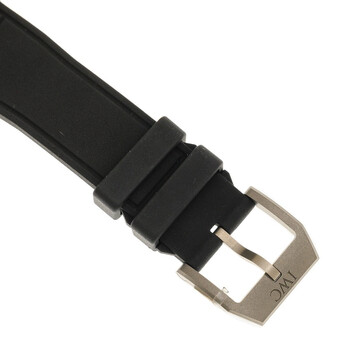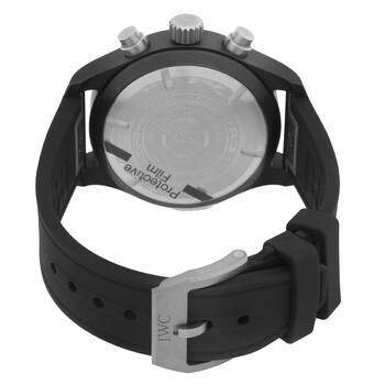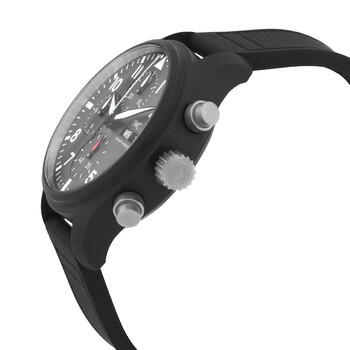Black ceramic case with a black rubber strap. Fixed black ceramic bezel. Black dial with black hands and index-Arabic numeral hour markers. Minute markers around the outer rim. Dial Type: Analog. Luminescent hands and markers. Day of the week and date display at the 3 o'clock position. Chronograph - three sub-dials displaying: 60 second, 30 minute and 12 hour. IWC Calibre 69380 Automatic movement, based upon WC 69370, containing 33 Jewels, bitting at 28800 vph, and has a power reserve of approximately 48 hours. Scratch resistant sapphire crystal. Screw down crown. Solid case back. Round case shape, case size: 41.9 mm, case thickness: 15.5 mm. Band width: 20 mm. Buckle clasp. Water resistant at 100 meters / 330 feet. Functions: chronograph, column wheel, date, day, hour, minute, small second. Pilot's Top Gun Series. Luxury watch style. Watch label: Swiss Made. IWC Pilots Top Gun Chronograph Automatic Black Dial Men's Watch IW389401.