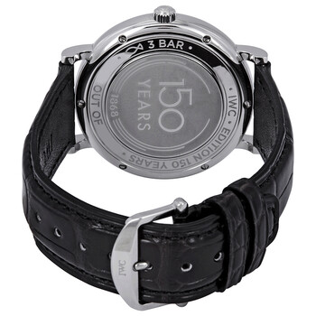 Silver-tone stainless steel case with a black alligator leather strap. Fixed bezel. White dial with blue hands and index-Roman numerals hour markers. Minute markers around the outer rim. Dial Type: Analog. Date display at the 3 o'clock position. IWC Calibre 35111 automatic movement with a 42-hour power reserve. Scratch resistant sapphire crystal. Solid case back. Round case shape, case size: 40 mm, case thickness: 9.3 mm. Band width: 20 mm. Water resistant at 30 meters / 100 feet. Functions: date, hour, minute, second. Additional Info: limited to 2000 pieces. 25 jewels. Luxury watch style. Watch label: Swiss Made. IWC Portofino "150 Years" White Dial Automatic Unisex Watch IW356519.