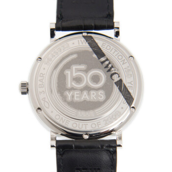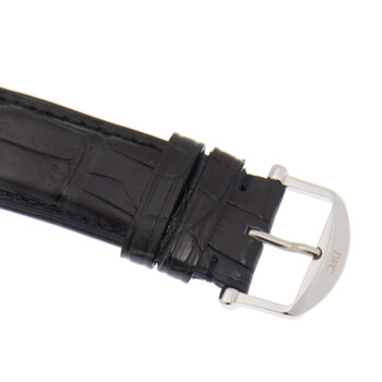 Stainless steel case with a black (alligator) leather strap. Fixed stainless steel bezel. Blue dial with silver-tone leaf-style hands and index hour markers. Roman numerals appear at the 6 and 12 o'clock positions. Arabic numeral minute markers (at 5 minute intervals). Minute markers around the outer rim. Dial Type: Analog. Date display at the 3 o'clock position. IWC calibre 35110 automatic movement, based upon Sellita SW300, containing 25 Jewels, bitting at 28800 vph, and has a power reserve of approximately 42 hours. Scratch resistant sapphire crystal. Pull / push crown. Solid case back. Round case shape. Case size: 40 mm. Case thickness: 9.2 mm. Band width: 20 mm. Tang clasp. Water resistant at 30 meters / 100 feet. Functions: date, hour, minute, second. Additional Info: limited to 2000 pieces. Portofino Series. Luxury watch style. Watch label: Swiss Made. IWC Portofino Automatic "150 Years" Blue Dial Men's Watch IW356518.