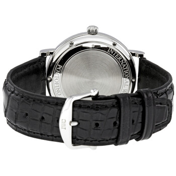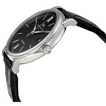 Stainless steel case with a black (alligator) leather strap. Fixed stainless steel bezel. Black dial with silver-tone leaf-style hands and index hour markers. Roman numerals mark the 6 and 12 o'clock positions. Arabic numeral minute markers (at 5 minute intervals). Minute markers around the outer rim. Dial Type: Analog. Date display at the 3 o'clock position. IWC calibre 35110 automatic movement, based upon Sellita SW300, containing 25 Jewels, bitting at 28800 vph, and has a power reserve of approximately 42 hours. Scratch resistant sapphire crystal. Pull / push crown. Solid case back. Round case shape. Case size: 40 mm, case thickness: 9.5 mm. Band width: 20 mm. Band length: 8 inches. Tang clasp. Water resistant at 30 meters / 100 feet. Functions: date, hour, minute, second. Portofino Series. Dress watch style. Watch label: Swiss Made. IWC Portofino Automatic Black Dial Black Leather Men's Watch 3565-02.