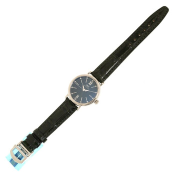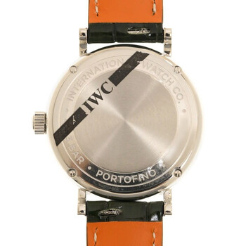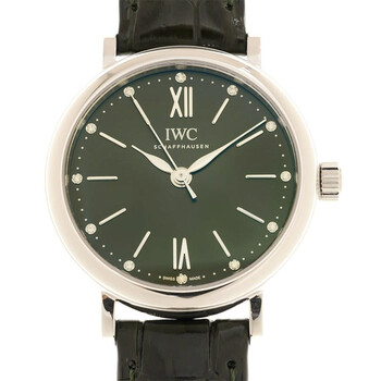 Silver-tone stainless steel case with a green alligator leather strap. Fixed silver-tone stainless steel bezel. Green dial with silver-tone hands and diamond-tipped index hour markers. Minute markers around the outer rim. Roman numeral markers at the 6 and 12 o'clock positions. Dial Type: Analog. IWC Calibre 35100 Automatic movement, based upon Sellita SW300-1, containing 25 Jewels, composed of 148 parts, bitting at 28800 vph, and has a power reserve of approximately 42 hours. Scratch resistant sapphire crystal. Pull / push crown. Solid case back. Round case shape, case size: 34 mm, case thickness: 8.6 mm. Band width: 16 mm. Water resistant at 30 meters / 100 feet. Functions: hour, minute, second. Portofino Series. Luxury watch style. Watch label: Swiss Made. IWC Portofino Automatic Diamond Green Dial Ladies Watch IW357405.