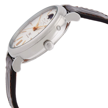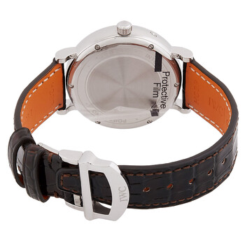 Silver-tone stainless steel case with a dark brown alligator/crocodile leather strap. Fixed bezel. Silver dial with rose gold-tone hands and index-diamonds hour markers. Dial Type: Analog. One subdial displaying: moonphase. IWC Calibre 35800 Automatic movement, based upon Sellita SW300-1, containing 25 Jewels, bitting at 28800 vph, and has a power reserve of approximately 42 hours. Scratch resistant sapphire crystal. Pull / push crown. Solid case back. Round case shape, case size: 37 mm, case thickness: 10.8 mm. Band width: 18 mm. Tang buckle clasp. Water resistant at 30 meters / 100 feet. Functions: moon phase, hour, minute, second. Portofino Series. Luxury watch style. Watch label: Swiss Made. IWC Portofino Automatic Diamond Silver Dial Ladies Watch IW459011.