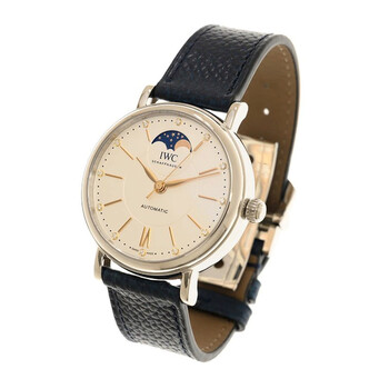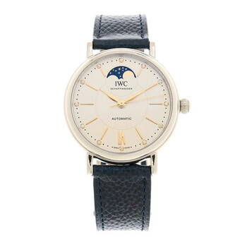 Silver-tone stainless steel case with a blue leather strap. Fixed silver-tone stainless steel bezel. White dial with yellow gold-tone hands and diamond hour markers. Minute markers around the outer rim. Dial Type: Analog. IWC Calibre 32800 automatic movement with a 120-hour power reserve. Scratch resistant sapphire crystal. Transparent see through case back. Round case shape, case size: 37 mm. Deployment with push button release clasp. Water resistant at 50 meters / 165 feet. Functions: hour, minute, second, moon phase. Portofino Series. Luxury watch style. Watch label: Swiss Made. IWC Portofino Automatic Diamond White Dial Men's Watch IW459601.