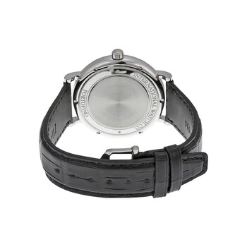 Stainless steel case with a black (crocodile) leather strap. Fixed stainless steel bezel. Silver dial with silver-tone leaf-style hands and index hour markers. Roman numerals mark the 6 and 12 o'clock positions. Minute markers around the outer rim. Dial Type: Analog. Date display at the 3 o'clock position. IWC calibre 35110 automatic movement, based upon Sellita SW300, containing 25 Jewels, bitting at 28800 vph, and has a power reserve of approximately 42 hours. Scratch resistant sapphire crystal. Pull / push crown. Solid case back. Round case shape. Case size: 40 mm. Case thickness: 9.5 mm. Band width: 20.3 mm. Band length: 8 inches. Tang clasp. Water resistant at 30 meters / 100 feet. Functions: date, hour, minute, second. Portofino Automatic Series. Dress watch style. Watch label: Swiss Made. IWC Portofino Automatic Silver Dial Black Leather Men's Watch 3565-01.