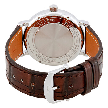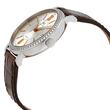 Stainless steel case with a brown (alligator) leather strap. Fixed stainless steel bezel set with 66 diamonds. Silver dial with rose gold-tone hands and index hour markers. Roman numerals mark the 6 and 12 o'clock positions. Minute markers around the outer rim. Dial Type: Analog. Date display at the 3 o'clock position. IWC calibre 35111 automatic movement with a 42-hour power reserve. Scratch resistant sapphire crystal. Pull / push crown. Solid case back. Round case shape. Case size: 37 mm. Case thickness: 9 mm. Tang clasp. Water resistant at 30 meters / 100 feet. Functions: date, hour, minute, second. Luxury watch style. Watch label: Swiss Made. IWC Portofino Automatic Silver Dial Diamond Ladies Watch 4581-03