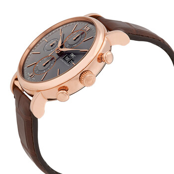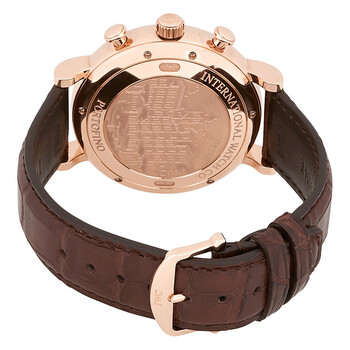 18kt rose gold case with a dark brown alligator leather strap. Fixed 18kt rose gold bezel. Ardoise dial with rose gold-tone leaf-style shape hands and index hour markers. Stylized roman numerals mark the 6 and 12 o'clock positions. minute markers around the outer rim. Dial Type: Analog. Day of the week and date display at the 3 o'clock position. Chronograph - three sub-dials displaying: 60 second, 30 minute and 12 hour. IWC Calibre 75320 Automatic movement, based upon Sellita SW500-1, containing 25 Jewels, bitting at 28800 vph, and has a power reserve of approximately 44 hours. Scratch resistant sapphire crystal. Pull / push crown. Solid case back. Round case shape, case size: 42 mm, case thickness: 13.5 mm. Tang clasp. Water resistant at 30 meters / 100 feet. Functions: chronograph, date, day, hour, minute, second. Portofino Series. Luxury watch style. Watch label: Swiss Made. IWC Portofino Chronograph Ardoise Dial Men's Watch IW391021.