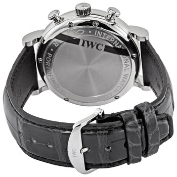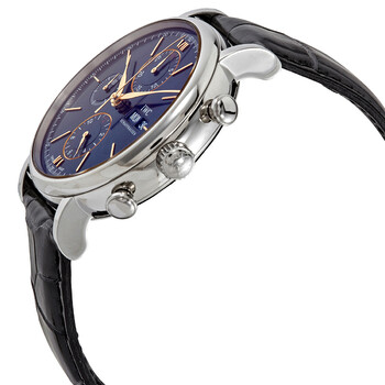 Stainless steel case with a black (alligator) leather strap. Fixed stainless steel bezel. Blue dial with rose gold-tone leaf-style hands and index hour markers. Roman numerals mark the 6 and 12 o'clock positions. Minute markers around the outer rim. Dial Type: Analog. Day of the week and date display at the 3 o'clock position. Chronograph - three sub-dials displaying: 60 second, 30 minute and 12 hours. IWC calibre 75320 automatic movement, based upon Sellita SW500-1, containing 25 Jewels, bitting at 28800 vph, and has a power reserve of approximately 44 hours. Scratch resistant sapphire crystal. Pull / push crown. Solid case back. Round case shape. Case size: 42 mm. Case thickness: 13.6 mm. Band width: 20 mm. Tang clasp. Water resistant at 30 meters / 100 feet. Functions: chronograph, date, day of the week, hour, minute, second. Portofino Series. Luxury watch style. Watch label: Swiss Made. IWC Portofino Chronograph Automatic Blue Dial Men's Watch IW391036.