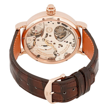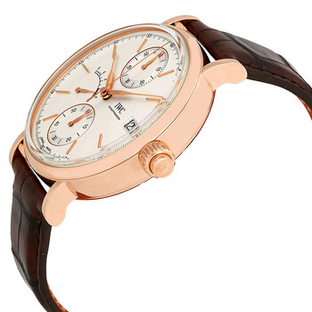 18k rose gold case with a brown alligator leather strap. Fixed bezel. Silver-plated dial with rose gold-tone hands and index hour markers. Minute markers around the outer rim. Dial Type: Analog. Date display at the 3 o'clock position. Chronograph - three sub-dials displaying: 60 second, 60 minute and power reserve. Hand wind movement. Caliber 59360 engine. Scratch resistant sapphire crystal. Case diameter: 45 mm. Case thickness: 13 mm. Round case shape. Water resistant at 30 meters / 100 feet. Functions: chronograph, date, hour, minute, second. Luxury watch style. Watch label: Swiss Made. IWC Portofino Monopusher Silver-Plated Dial Chronograph 18K Rose Gold Men's Watch IW515104.