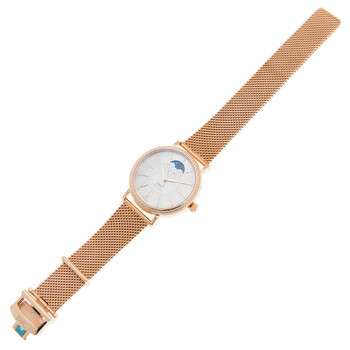18kt pink gold case with a 18kt pink gold mesh bracelet. Fixed 18kt pink gold bezel with 66 brilliant cut diamond set. Mother of pearl dial with rose gold-tone leaf-style shape hands and index and diamond hour markers. Minute markers around the outer rim. Dial Type: Analog. IWC Calibre 35800 Automatic movement, based upon Sellita SW300-1, containing 25 Jewels, bitting at 28800 vph, and has a power reserve of approximately 42 hours. Scratch resistant sapphire crystal. Solid case back. Round case shape, case size: 37 mm, case thickness: 10.8 mm. Band width: 18 mm. Deployment clasp. Water resistant at 30 meters / 100 feet. Functions: moon phase, hour, minute, second. Additional Info: case with 66 diamonds. Portofino Series. Luxury watch style. Watch label: Swiss Made. IWC Portofino Mother of Pearl Dial Diamond 18k Rose Gold Automatic Unisex Watch 4590-05.