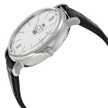 Stainless steel case with a black alligator leather strap. Fixed 18kt white gold bezel. Silver dial with silver-tone leaf-style shape hands and index hour markers. Roman numerals mark the 6 and 12 o'clock positions. minute markers around the outer rim. Dial Type: Analog. One subdial displaying: power reserve indicator on caseback. IWC Calibre 59060 Hand Wind movement, based upon IWC 59210, containing 30 Jewels, bitting at 28800 vph, and has a power reserve of approximately 192 hours. Scratch resistant sapphire crystal. Pull / push crown. Skeleton case back. Round case shape, case size: 43.5 mm, case thickness: 12 mm. Water resistant at 30 meters / 100 feet. Functions: hour, minute, power reserve indicator. Additional Info: power reserve indicator on case back. Portofino Series. Luxury watch style. Watch label: Swiss Made. IWC Portofino Silver Dial 8 Day Power Reserve Black Leather Men's Watch 5111-02.