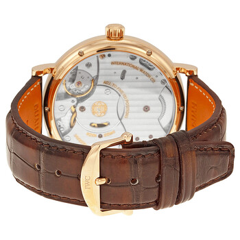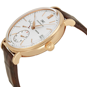 18kt rose gold case with a dark brown leather strap. Fixed 18kt rose gold bezel. Silver dial with rose gold hands and index hour markers. A Roman numeral marks the 12 o'clock position. Minute markers around the outer rim. Dial Type: Analog. Date display at the 3 o'clock position. Two sub-dials displaying: small second and power reserve. IWC calibre 59210 hand wind movement with a 192 hour power reserve. Anti-reflective scratch resistant sapphire crystal. Push / pull crown. See-through sapphire case back. Case size: 45 mm. Case thickness: 12 mm. Round case shape. Tang clasp. Water resistant at 30 meters / 100 feet. Functions: date, hour, minute, small second, power reserve. Luxury watch style. Watch label: Swiss Made. IWC Portofino Hand Wind Silver Dial Brown Leather Strap Men's Watch IW510107.