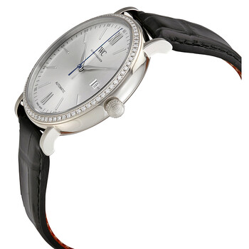 Silver-tone stainless steel case with a black alligator leather strap. Fixed silver-tone bezel with diamond set. Silver dial with silver-toned leaf-style shape hands and index hour markers. Minute markers around the outer rim. Dial Type: Analog. Date display at the 3 o'clock position. IWC Calibre 35111 Automatic movement, based upon Sellita SW300-1, containing 25 Jewels, composed of 163 parts, bitting at 28800 vph, and has a power reserve of approximately 42 hours. Scratch resistant sapphire crystal. Pull / push crown. Solid case back. Round case shape, case size: 40 mm, case thickness: 9.5 mm. Tang clasp. Water resistant at 30 meters / 100 feet. Functions: date, hour, minute, second. Portofino Series. Luxury watch style. Watch label: Swiss Made. IWC Portofino Silver Dial Diamond Automatic Men's Watch 3565-14.