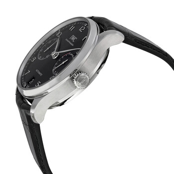 Stainless steel case with a black (alligator) leather strap. Fixed stainless steel bezel. Black dial with silver-tone leaf-style hands and Arabic numeral hour markers. Minute markers around the outer rim. Dial Type: Analog. Luminescent hands and markers. Date display at the 6 o'clock position. Two sub-dials displaying: 60 seconds and power reserve. IWC calibre 52010 automatic movement, containing 31 Jewels, composed of 257 parts, bitting at 28800 vph, and has a power reserve of approximately 168 hours. Scratch resistant sapphire crystal. Screw down crown. Skeleton case back. Round case shape. Case size: 42.3 mm. Case thickness: 14.5 mm. Band width: 21 mm. Fold over clasp with a safety release. Water resistant at 30 meters / 100 feet. Functions: hour, minute, small second, power reserve indicator. Portugieser Series. Luxury watch style. Watch label: Swiss Made. IWC Portugieser Automatic Black Dial Men's Watch IW500703.