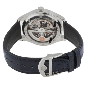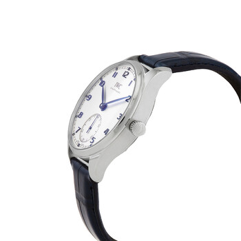 Stainless steel case with a blue (alligator) laether band. Fixed stainless steel bezel. Silver dial with blue hands and Arabic numeral hour markers. Minute markers around the outer rim. Dial Type: Analog. One subdial displaying: small seconds. IWC calibre 82200 automatic movement, containing 33 Jewels, bitting at 28800 vph, and has a power reserve of approximately 60 hours. Scratch resistant sapphire crystal. Screw down crown. Transparent case back. Round case shape. Case size: 40.4 mm. Case thickness: 12.3 mm. Band width: 20 mm. Deployment clasp. Water resistant at 30 meters / 100 feet. Functions: hour, minute, small second. Portugieser Series. Luxury watch style. Watch label: Swiss Made. IWC Portugieser Automatic Silver Dial Men's Watch IW358304.