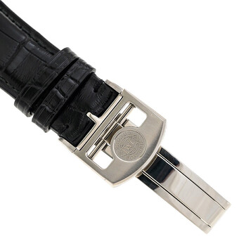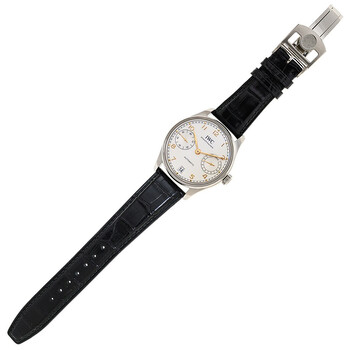 Silver-tone stainless steel case with a black leather strap. Fixed silver-tone stainless steel bezel. Silver dial with rose gold-tone hands and index-Arabic numeral hour markers. Minute scale around the inner rim. Dial Type: Analog. Date display at the 6 o'clock position. Two-60 minute and day subdials. IWC Calibre 52011 automatic movement with a 168-hour power reserve. Scratch resistant sapphire crystal. Screw down crown. Transparent see through case back. Round case shape, case size: 42.4 mm, case thickness: 12.9 mm. Buckle clasp. Water resistant at 50 meters / 165 feet. Functions: date, hour, minute. Portugieser Series. Sport watch style. Watch label: Swiss Made. IWC Portugieser Automatic Silver Dial Men's Watch IW501701.