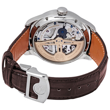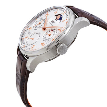 Silver-tone stainless steel case with a brown alligator leather strap. Fixed silver-tone stainless steel bezel. White dial with rose gold-tone leaf-style shape hands and Arabic numeral hour markers. Minute markers around the outer rim. Dial Type: digital. Perpetual calendar. Four sub-dials displaying: moonphase, month, combined day and 60 seconds, combined date and power reserve. IWC Calibre 52610 Automatic movement, containing 54 Jewels, bitting at 28800 vph, and has a power reserve of approximately 168 hours. Scratch resistant sapphire crystal. Transparent case back. Round case shape, case size: 44.2 mm, case thickness: 15.3 mm. Band width: 22 mm. Tang clasp. Water resistant at 30 meters / 100 feet. Functions: year, month, date, day, hour, minute, second, perpetual calendar, moonphase. Additional Info: portugieser limited to 250 pieces. Portugieser Perpetual Calendar Series. Sport watch style. Watch label: Swiss Made. IWC Portugieser Boutique Shanghai Perpetual Calendar Automatic White Dial Men's Watch IW503307.