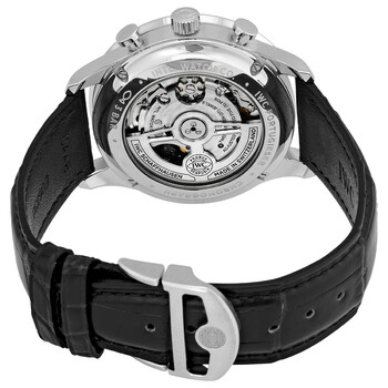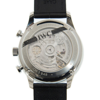 Stainless steel case with a black (alligator) leather strap. Fixed stainless steel bezel. Black dial with silver-tone leaf-style hands and Arabic numeral hour markers. Minute markers around the outer rim. Dial Type: Analog. Chronograph - two sub-dials displaying: 60 second and 30 minute. IWC calibre 69355 automatic movement, based upon IWC 69370, containing 27 Jewels, composed of 194 parts, bitting at 28800 vph, and has a power reserve of approximately 46 hours. Scratch resistant sapphire crystal. Screw down crown. Transparent case back. Round case shape. Case size: 41 mm. Case thickness: 13 mm. Fold over clasp. Water resistant at 30 meters / 100 feet. Functions: chronograph, column wheel, hour, minute, small second. Additional Info: original box, international warranty card, manual (complete accessories). Portugieser Series. Luxury watch style. Watch label: Swiss Made. IWC Portugieser Chronograph Automatic Black Dial Men's Watch IW371609.